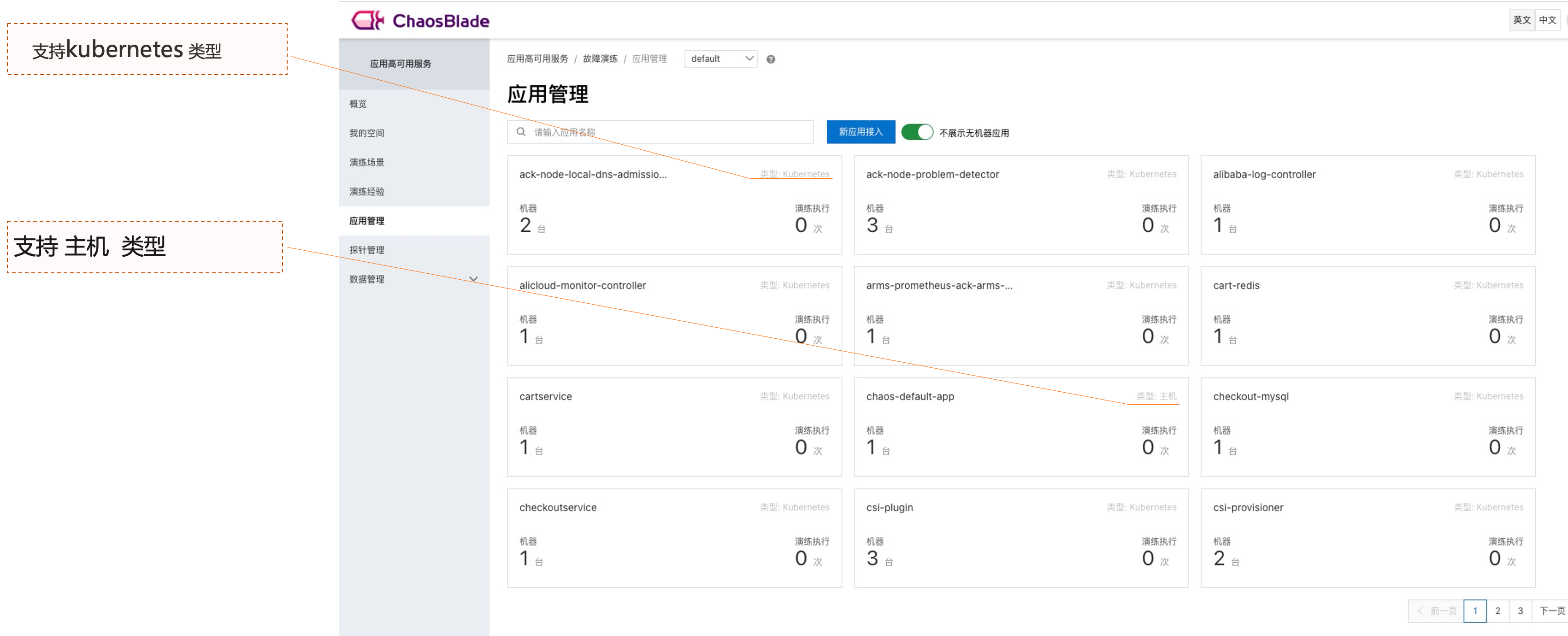 展示部署了Agent(探针)的主机或Kubernetes集群上的所有应用,Agent(探针)支持Kubernetes和主机环境安装,当安装在Kubernetes集群时,会主动收集集群中的pod相关数据,并根据label来判定其应用名和应用分组,从而直观且方便的对某个应用进行演练