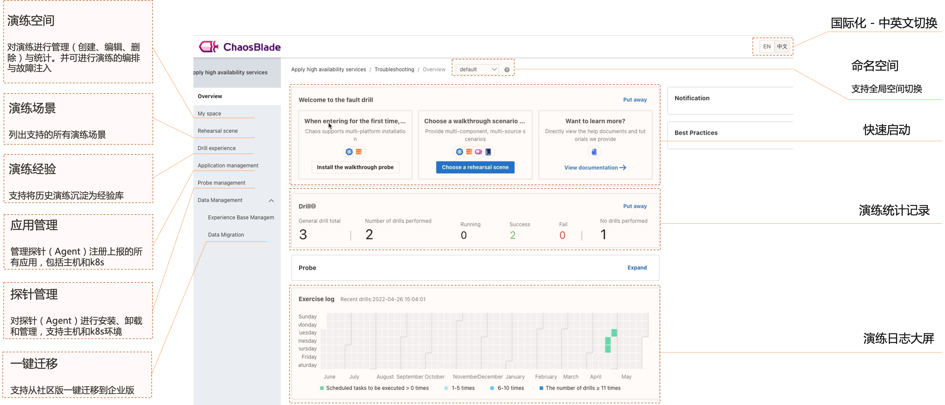ChaosBlade-Box混沌工程平台,支持中英文切换,提供了全局的命名空间切换,帮助企业落地时的一平台多用,如测试环境、灰度环境、线上环境等。
