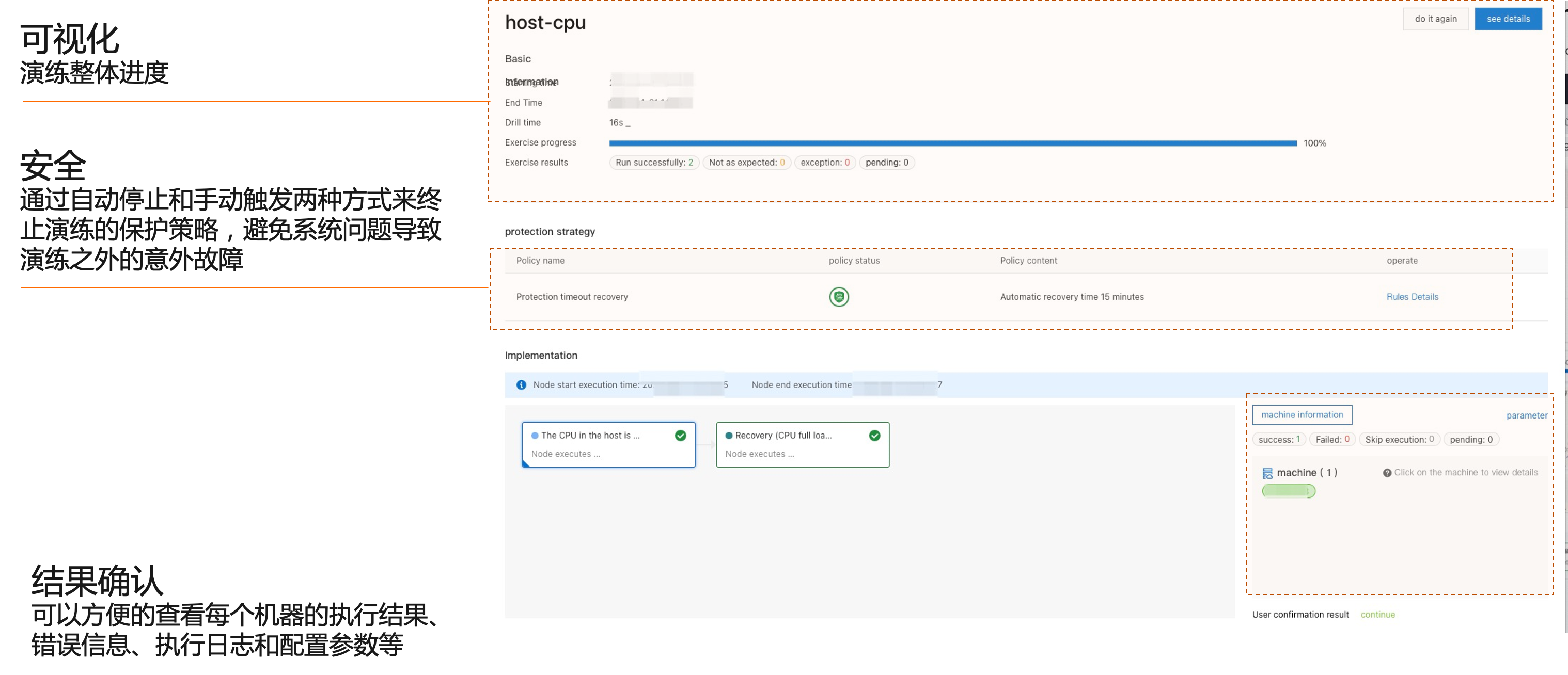 在演练结果页面中能查看到演练的整体进度,并能进行单个机器的结果、错误信息、执行日志和参数配置等查询。为保障演练一定能得到恢复,提供了自动停止和手动触发两种方式来终止演练的保护策略,下发超时参数,即便平台侧和Agent失联,无法下发恢复命令,也能超时恢复,避免系统问题导致演练之外的意外故障