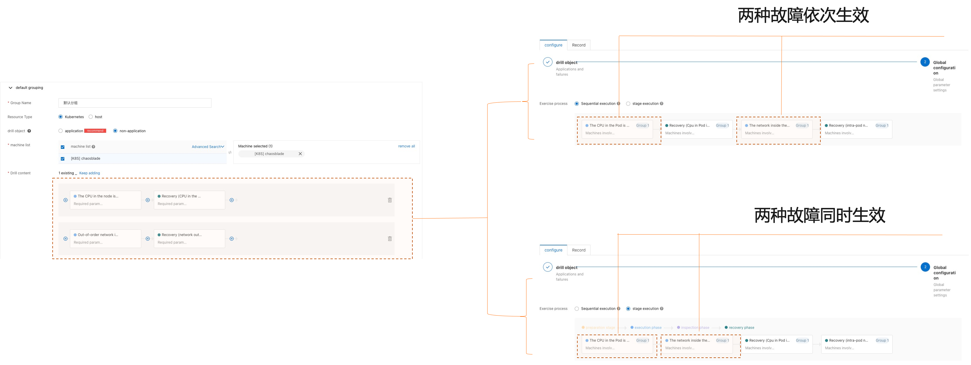 平台支持两种流程编排类型,分别是:“顺序执行”和“阶段执行”,其中“顺序执行”就是多种故障依次生效,“阶段执行”就是多种故障同时生效后再同时恢复。