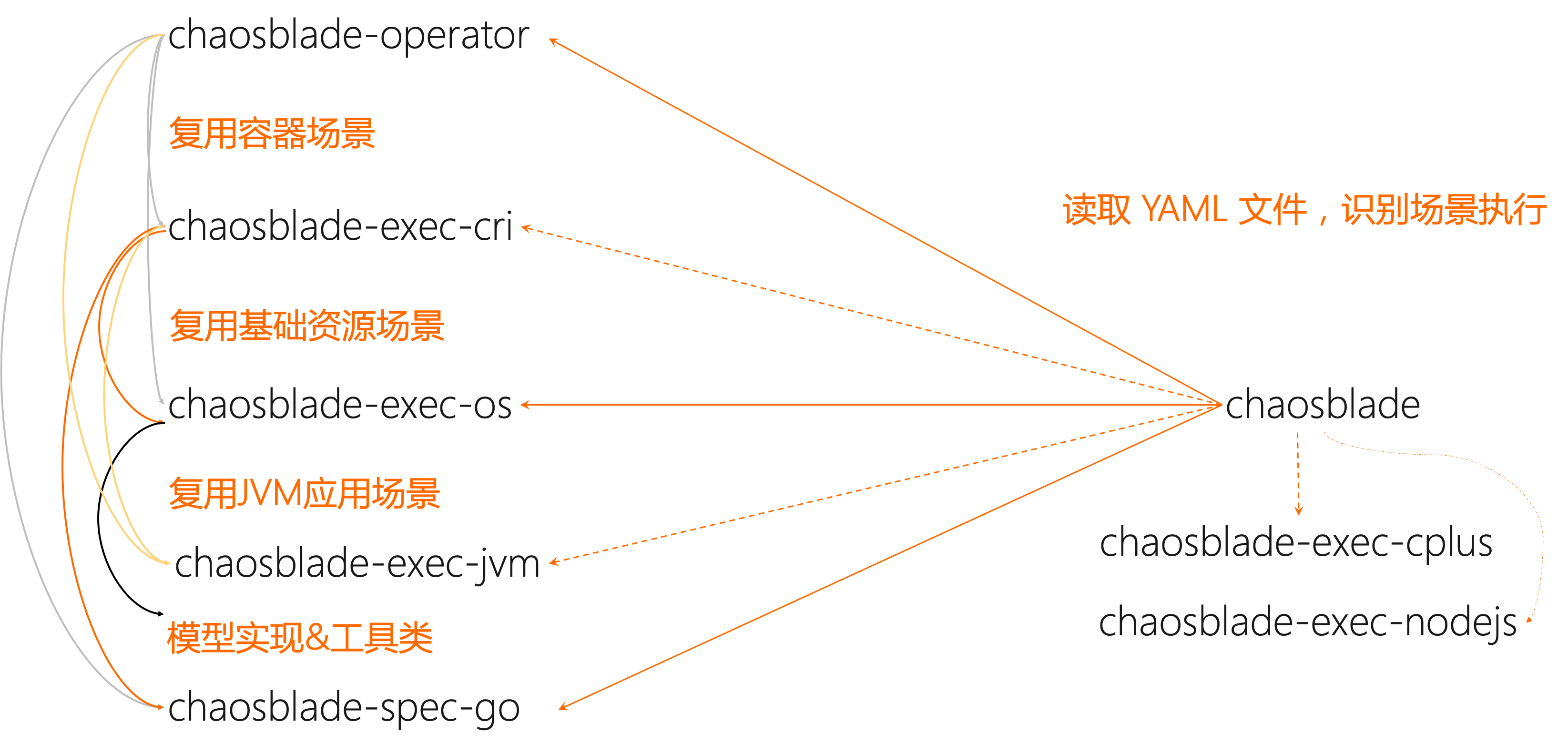 chaosblade 依据领域实现封装成各自独立的项目,每个项目根据各领域的最佳实践来实现,不仅能满足各领域使用习惯,而且还可以通过混沌实验模型来建立与 chaosblade cli 项目的关系,方便使用 chaosblade 来统一调用,各领域下的实验场景依据混沌实验模型生成 yaml 文件描述,暴露给上层混沌实验平台,混沌实验平台根据实验场景描述文件的变更,自动感知实验场景的变化,无需新增场景时再做平台开发,使混沌平台更加专注于混沌工程其他部分。